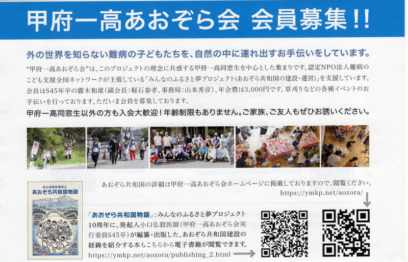 みんなのふるさと夢プロジェクト(あおぞら共和国)の建設・運営を支援する会として”甲府一高あおぞら会”を2015年 設立しました。皆様のおかげで、2025年までの夢プロジェクトへの累積支援額は2,000万円を超えました。 会の活動は同窓会での広報活動及び、あおぞら共和国でのイベント、春・秋のチャリティーウォーク、初夏・秋の草刈り ボランティアを柱とする様々なイベントへの支援/参加を行なって、ひとりでも多くの難病の子どもたちやその兄弟に、 風のそよぎ、小鳥のさえずり、満天の星を体験させてあげられるよう「あおぞら共和国」運営を支援しています。 |