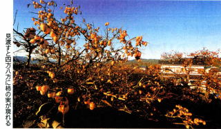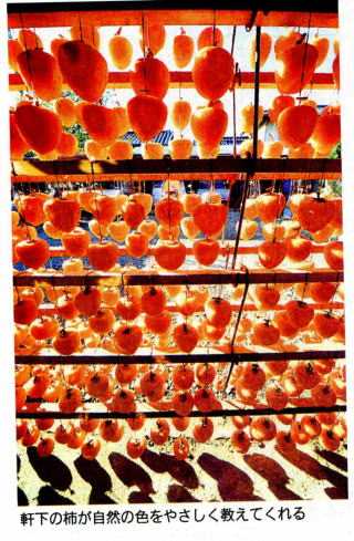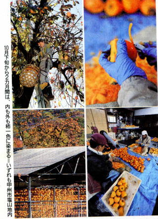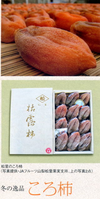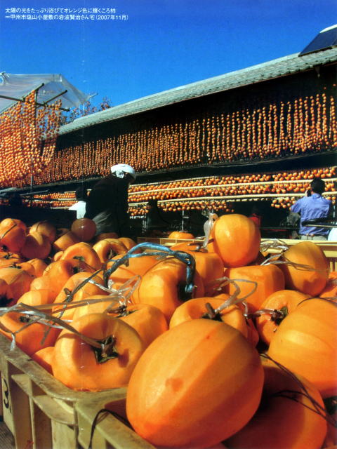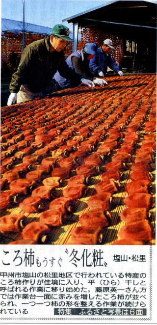 | 冬の逸品ころ柿 「松里のころ柿」といえば、全国にもその名が通る山梨を代表する冬の一級ブランドである。年末年始の贈答品として県内はもとより関東から関西まで出荷され、ナチュラルフードへの人気もあって、その豊かな味わいに固定フアンが増えている。生産農家は約400軒。秋には軒先にずらりとつるされた天日干しの風景 が風物詩にもなり=写真=、県内外からたくさんのカメラ愛好家も訪れる。ころ柿は漢字では「枯露柿」と書く。武田信玄の時代、乾柿が奨励され、美濃国から移植されたのが始まりとされている。その後、甲府城を築城じた豊臣秀吉の重臣浅野長政が柿の増産を奨めた。松里は枯露柿としても有名だが、信玄時代には良質な栗の産地としても知られた。 The Yamanashi 4 |