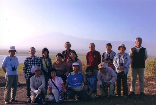キリマンジャロをバックに参加者全員の記念写真 撮影は添乗員