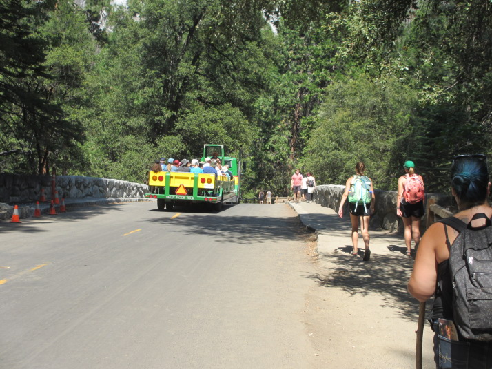 ヨセミテ公園観光 | ・朝1番 7:21発のバスでヨセミテ公園へ 往復 7$ 公園入場料は車35$/7日だがバス客は無 ・YosemiteValleyLodgeのツアーデスクでグレーシャーポイント行きのキャンセル待ち申し込み。 8:30発NG、10:30発OKだったが予約客が遅れて来てNG、 トラム12:00を予約(36.75$)。 ・大型トラックにベンチを乗せたトラムで公園内のビューポイントを2時間で周遊。 暑い35度くらい ・昼食はValleyLodgeの食堂で皿盛り込みランチ ・17番のバス停まで行き、ミラーレイクトレイル(約1.6km)を歩く。湖は水遊びOK ・園内は何処の駐車場もほぼ満車、土日は道も渋滞。15:45発YARTSバスでLodgeへ戻る。 ・夕食はマルちゃん正メンを作って、ビール・・・・ 宿泊:Yosemite view Lodge, El Portal TVは東芝製 衛星受信 |