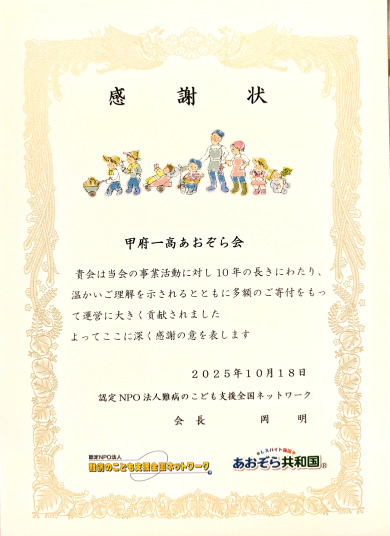 難病ネットより感謝状をいただきました |