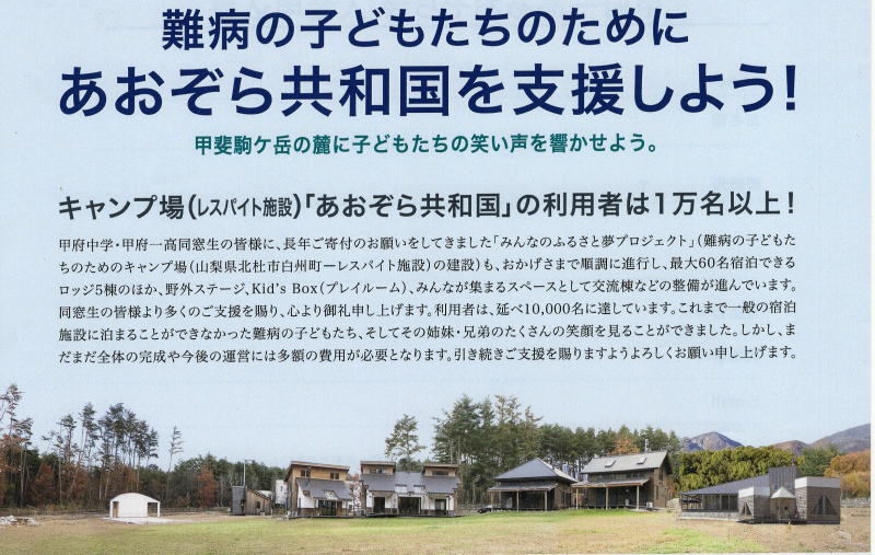 みんなのふるさと夢プロジェクト(あおぞら共和国)の建設・運営を支援する会として”甲府一高あおぞら会”を2015年 設立しました。皆様のおかげで、2025年までの夢プロジェクトへの累積支援額は2,000万円を超えました。 会の活動は同窓会での広報活動及び、あおぞら共和国でのイベント、春・秋のチャリティーウォーク、初夏・秋の草刈り ボランティアを柱とする様々なイベントへの支援/参加を行なって、ひとりでも多くの難病の子どもたちやその兄弟に、 風のそよぎ、小鳥のさえずり、満天の星を体験させてあげられるよう「あおぞら共和国」運営を支援しています。 |